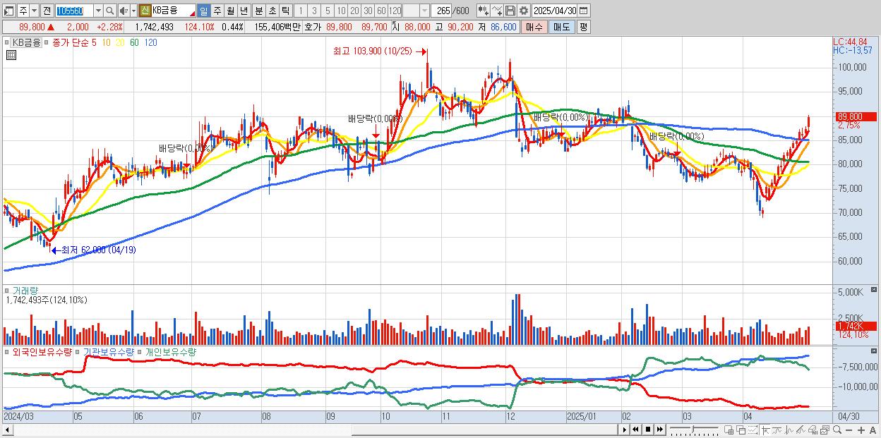 - KB금융 (90,200원 ▲ 2.73% , 시총: 354,963억, 거래량: 1,614,509, 거래대금:1,440억)