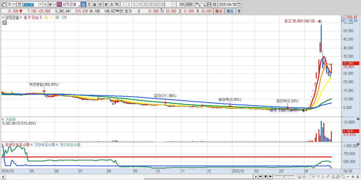 - 상지건설 (31,000원 ▲ 29.98% , 시총: 1,234억, 거래량: 5,342,841, 거래대금:1,486억)