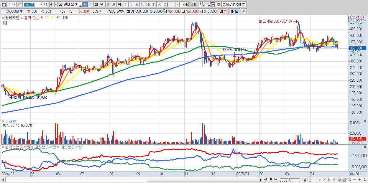 - 알테오젠 (351,000원 ▼ -3.31% , 시총: 187,149억, 거래량: 300,126, 거래대금:1,063억)