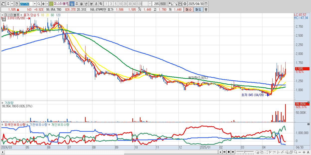 - 미스터블루 (1,585원 ▲ 9.92% , 시총: 1,317억, 거래량: 99,954,780, 거래대금:1,667억)