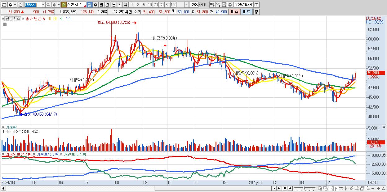 - 신한지주 (51,400원 ▲ 1.98% , 시총: 258,771억, 거래량: 1,685,443, 거래대금:865억)