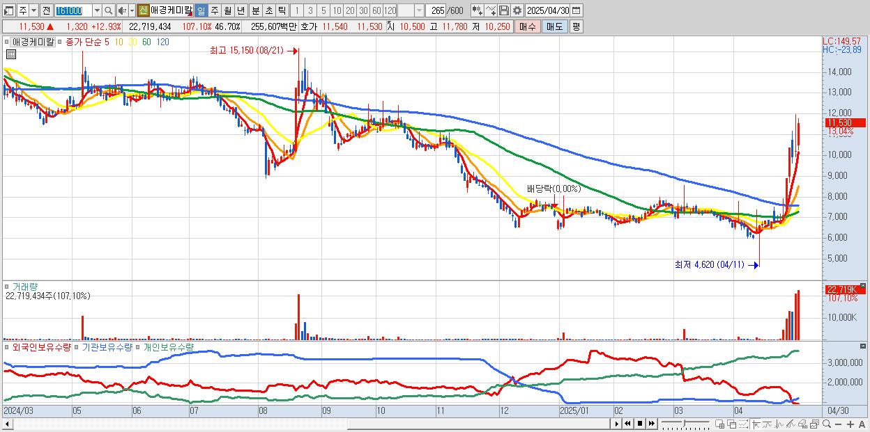 - 애경케미칼 (11,430원 ▲ 11.95% , 시총: 5,561억, 거래량: 11,646,116, 거래대금:1,308억)