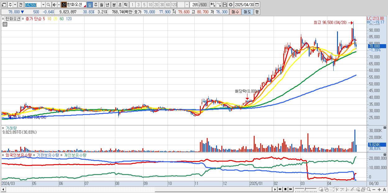 - 한화오션 (78,500원 0% , 시총: 240,535억, 거래량: 5,235,325, 거래대금:4,083억)