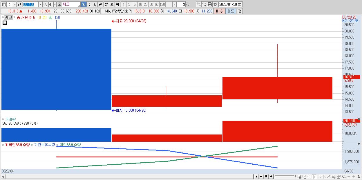 - 쎄크 (16,310원 ▲ 9.98% , 시총: 1,423억, 거래량: 26,190,659, 거래대금:4,465억)