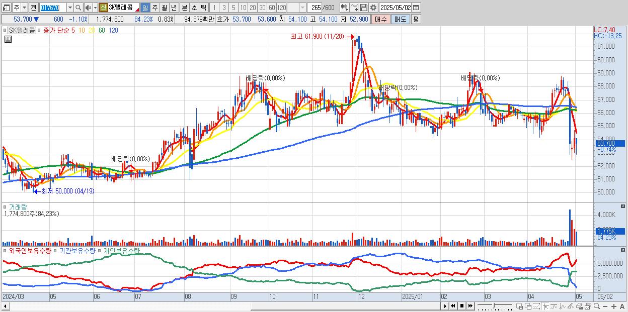 - SK텔레콤 (53,700원 ▼ -1.1% , 시총: 115,342억, 외국인 순매수 거래금:204억)