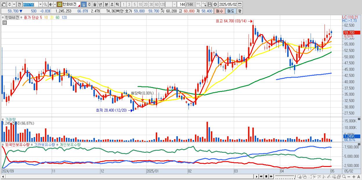 - 한화비전 (59,900원 ▼ -0.5% , 시총: 30,243억, 외국인 순매수 거래금:75억)