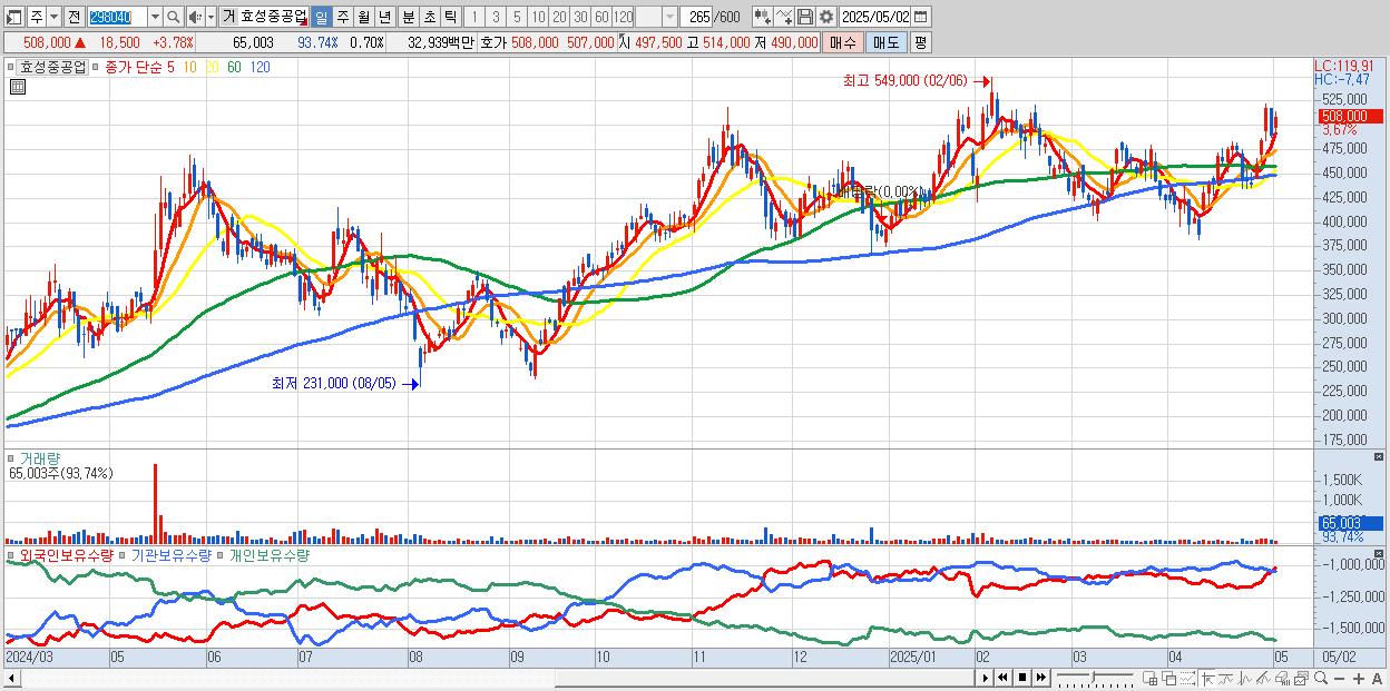 - 효성중공업 (507,000원 ▲ 3.58% , 시총: 47,275억, 외국인 순매수 거래금:68억)