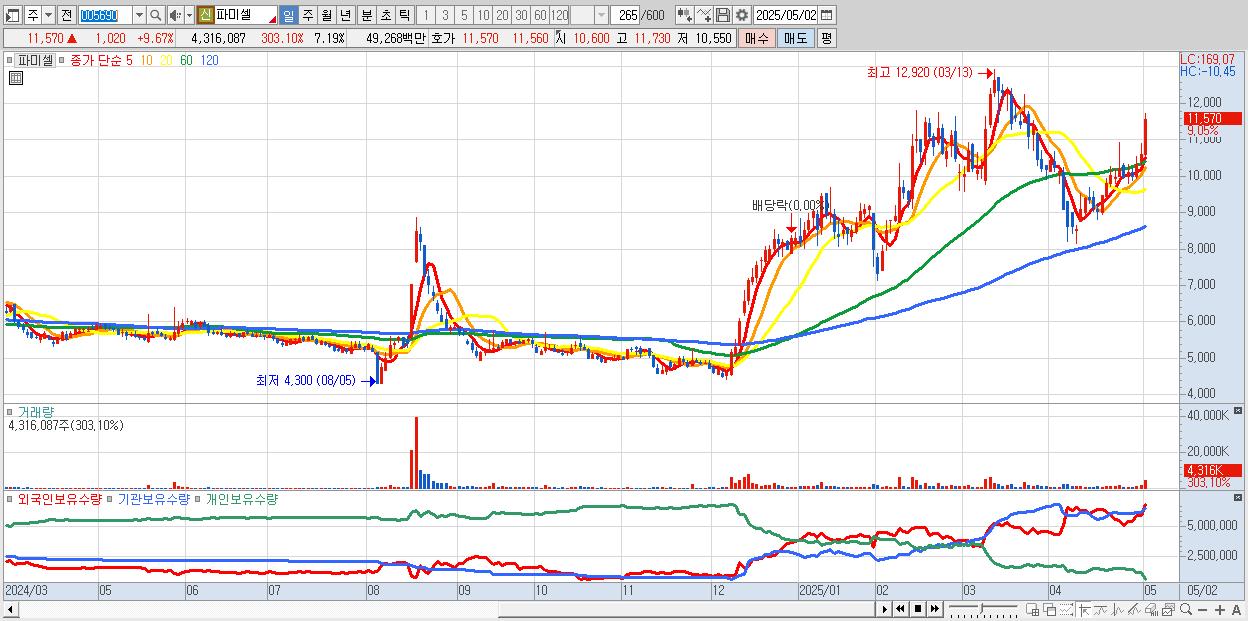 - 파미셀 (11,600원 ▲ 9.95% , 시총: 6,962억, 외국인 순매수 거래금:52억)