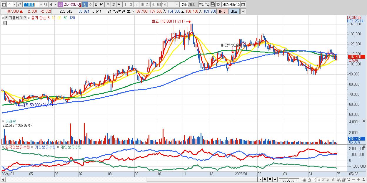 - 리가켐바이오 (108,200원 ▲ 3.05% , 시총: 39,612억, 외국인 순매수 거래금:48억)