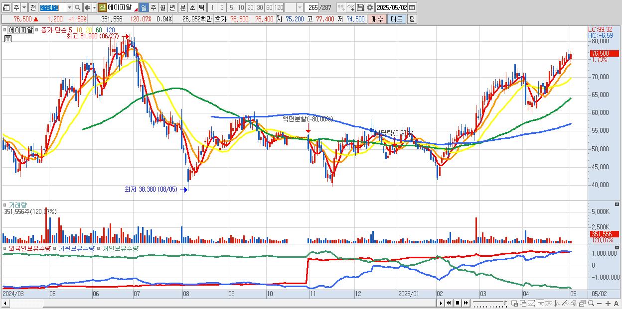 - 에이피알 (76,200원 ▲ 1.2% , 시총: 28,561억, 외국인 순매수 거래금:64억)