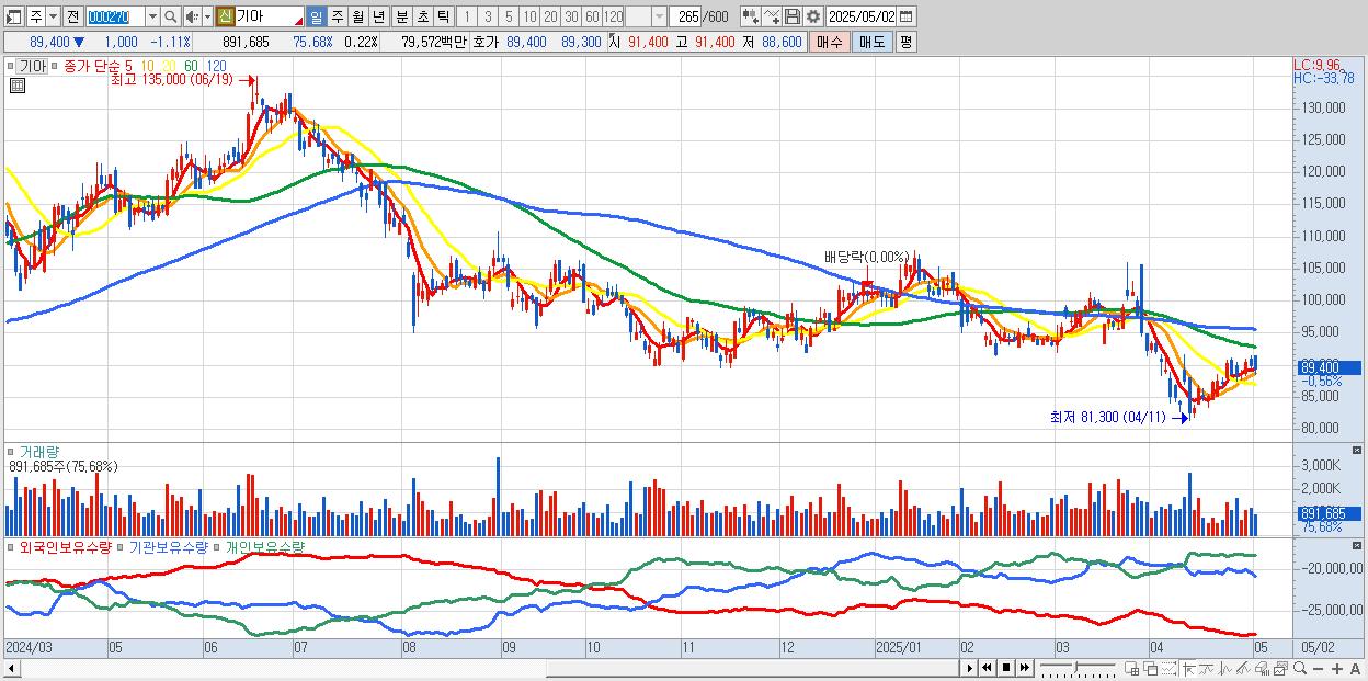 - 기아 (89,400원 ▼ -1.11% , 시총: 355,519억, 외국인 순매수 거래금:58억)