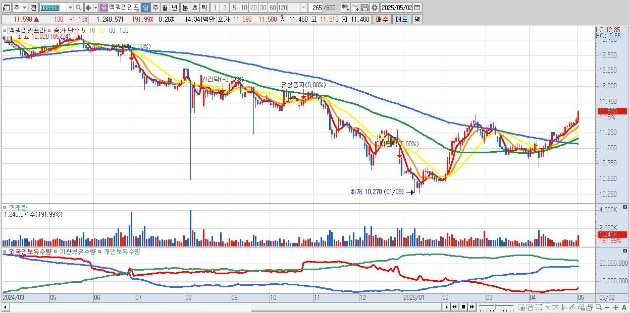 - 맥쿼리인프라 (11,590원 ▲ 1.13% , 시총: 55,507억, 외국인 순매수 거래금:59억)