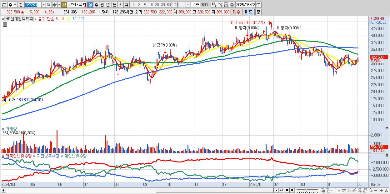- HD현대일렉트릭 (323,000원 ▲ 5.04% , 시총: 116,432억, 외국인 순매수 거래금:311억)