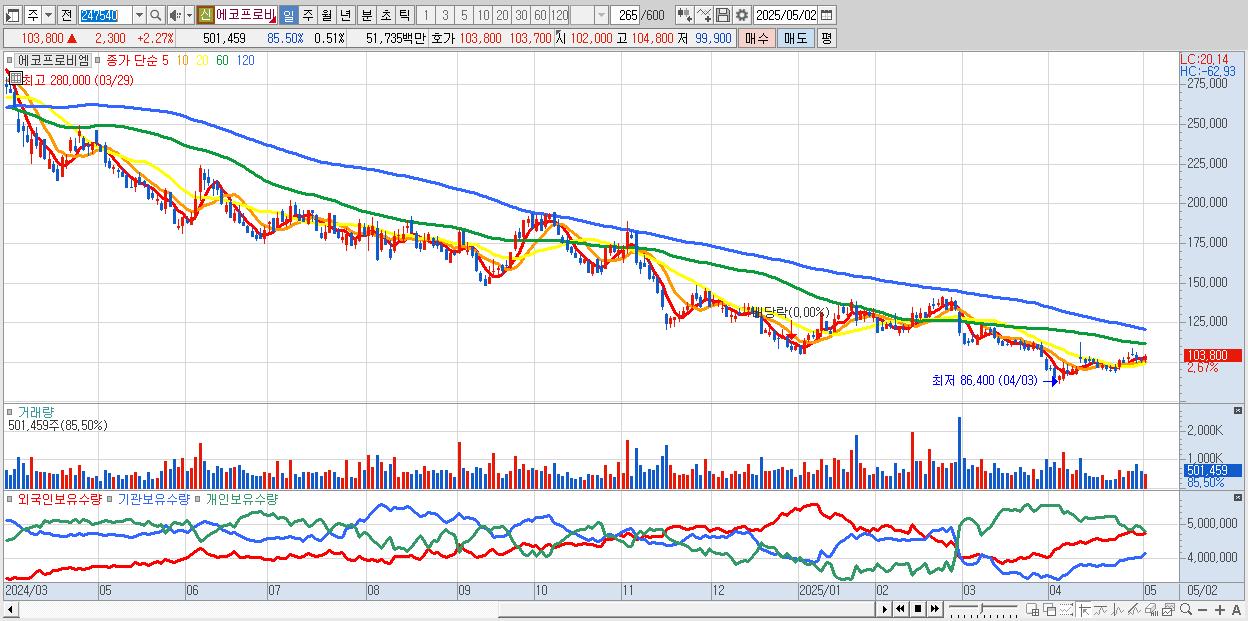- 에코프로비엠 (104,500원 ▲ 2.96% , 시총: 102,202억, 외국인 순매수 거래금:43억)