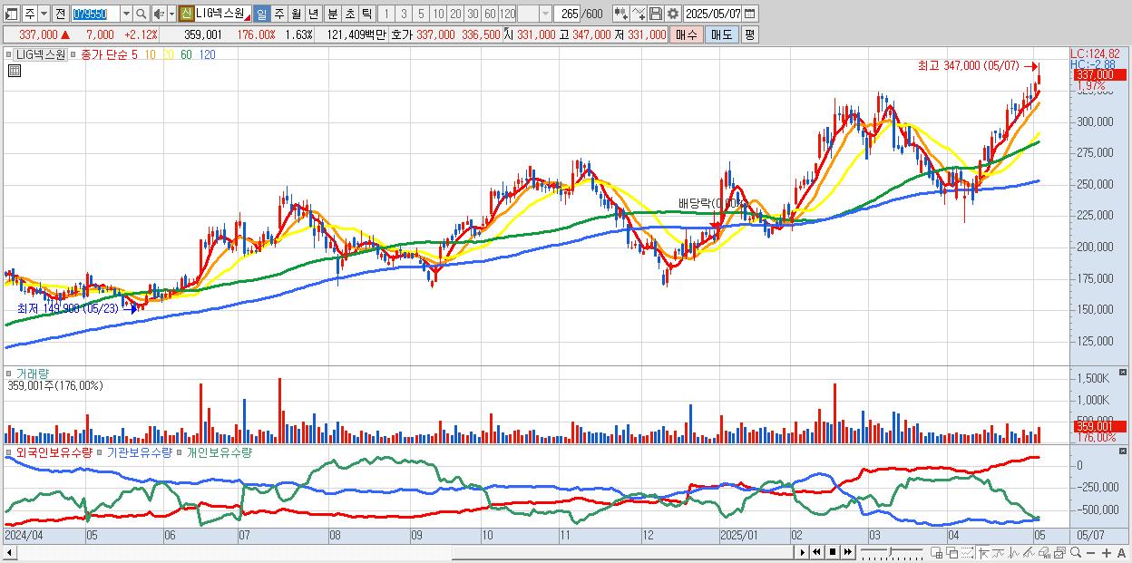 - LIG넥스원 (336,500원 ▲ 1.97% , 시총: 74,030억, 거래량: 277,389, 거래대금:938억)