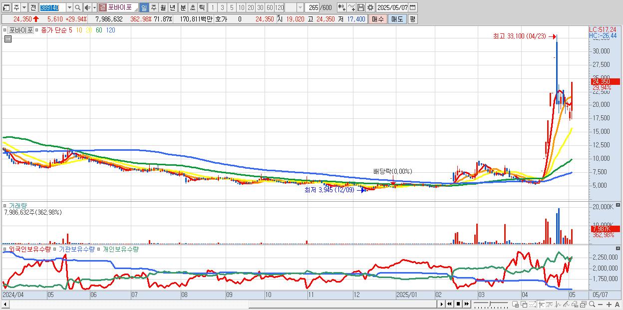 - 포바이포 (24,350원 ▲ 29.94% , 시총: 2,706억, 거래량: 7,986,632, 거래대금:1,708억)