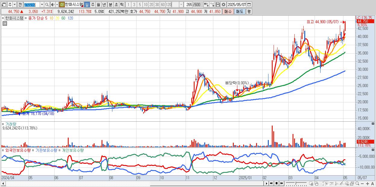 - 한화시스템 (44,650원 ▲ 7.07% , 시총: 84,353억, 거래량: 5,005,866, 거래대금:2,197억)