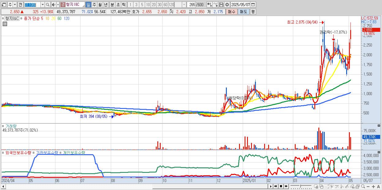 - 형지I&C (2,650원 ▲ 13.98% , 시총: 836억, 거래량: 49,373,787, 거래대금:1,275억)