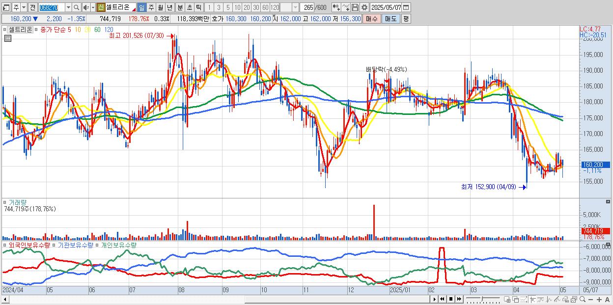 - 셀트리온 (160,300원 ▼ -1.29% , 시총: 357,453억, 거래량: 586,080, 거래대금:932억)