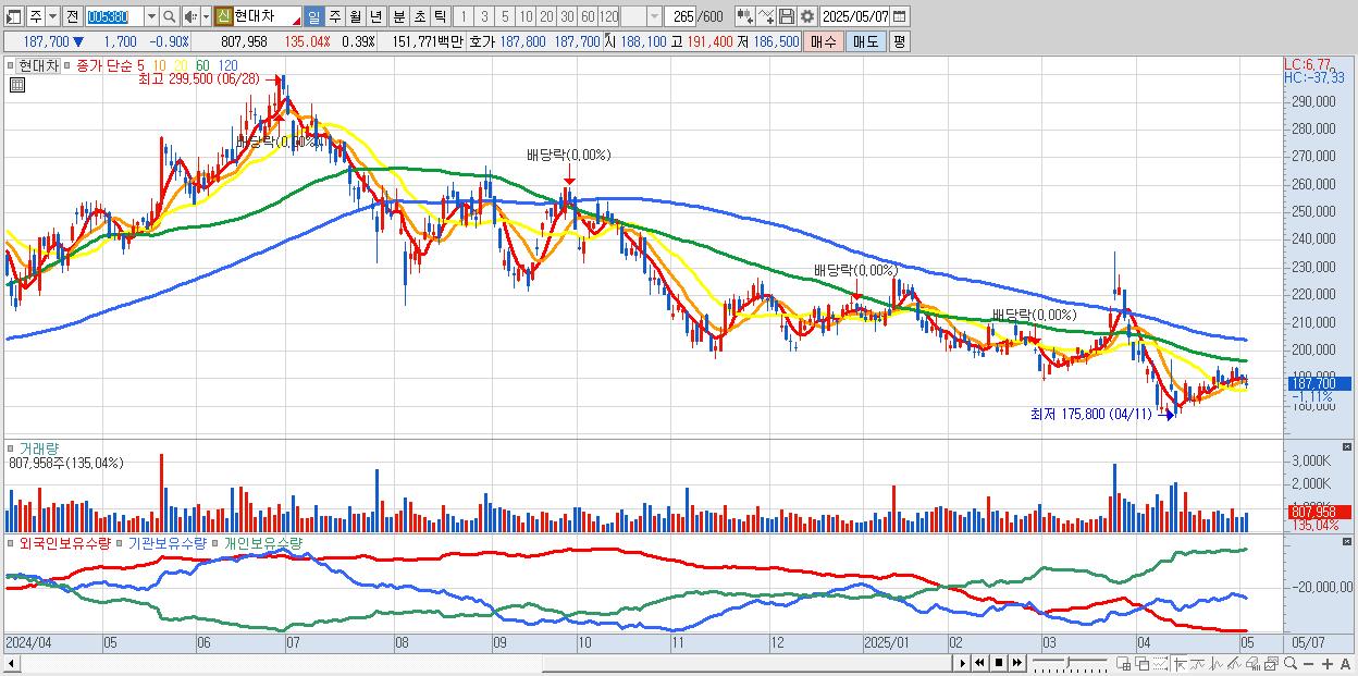 - 현대차 (187,600원 ▼ -0.95% , 시총: 392,865억, 거래량: 666,181, 거래대금:1,252억)