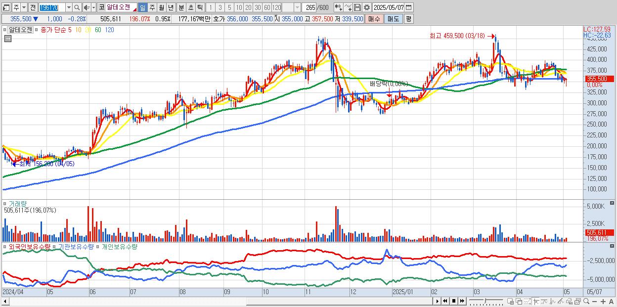 - 알테오젠 (356,500원 0% , 시총: 190,082억, 거래량: 330,455, 거래대금:1,160억)