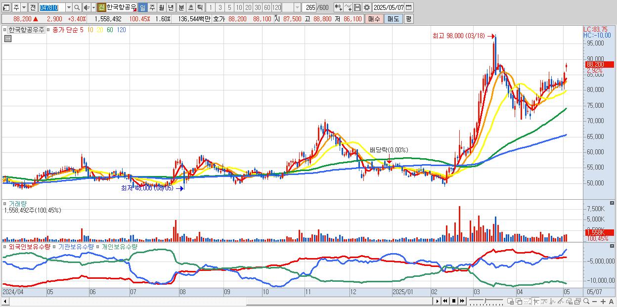 - 한국항공우주 (88,000원 ▲ 3.17% , 시총: 85,778억, 거래량: 1,082,767, 거래대금:949억)