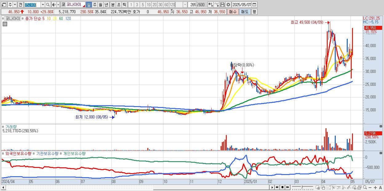 - 코나아이 (46,950원 ▲ 29.88% , 시총: 6,837억, 거래량: 2,991,064, 거래대금:1,291억)