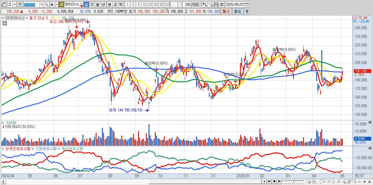 - SK하이닉스 (190,800원 ▲ 2.58% , 시총: 1,389,029억, 거래량: 3,830,097, 거래대금:7,268억)