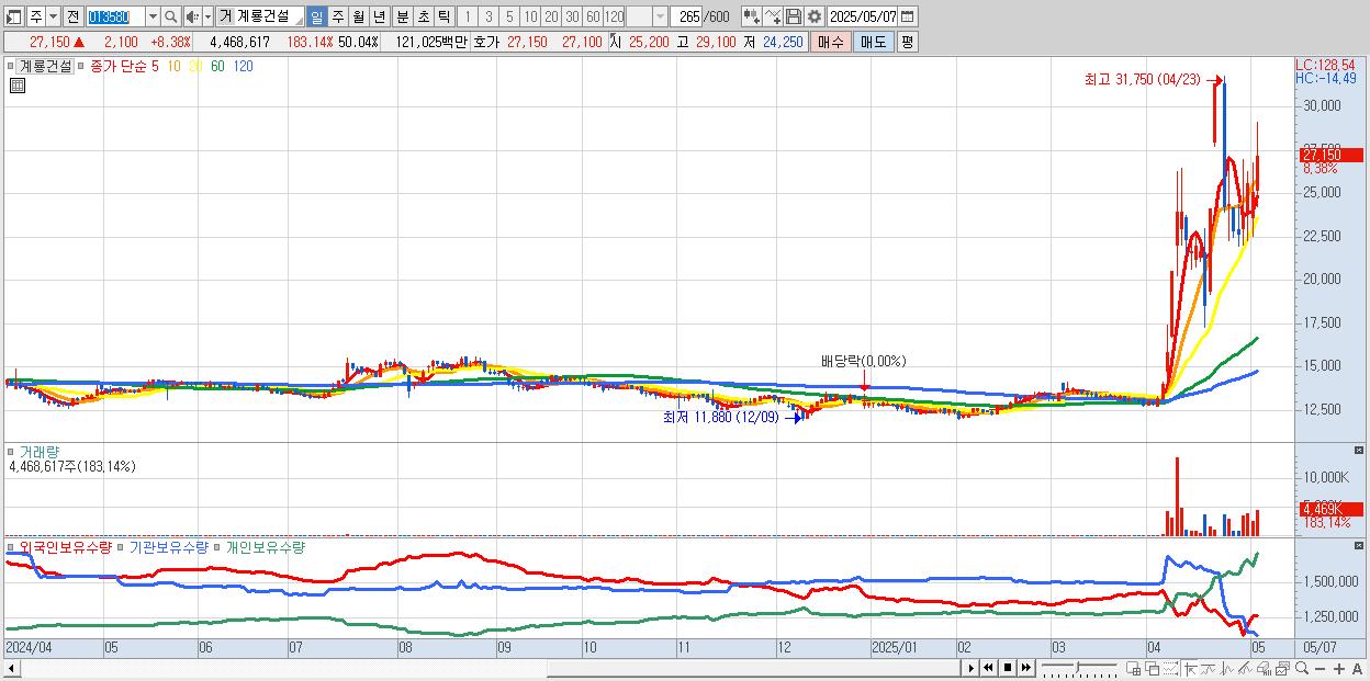 - 계룡건설 (27,150원 ▲ 8.38% , 시총: 2,425억, 거래량: 4,468,617, 거래대금:1,210억)