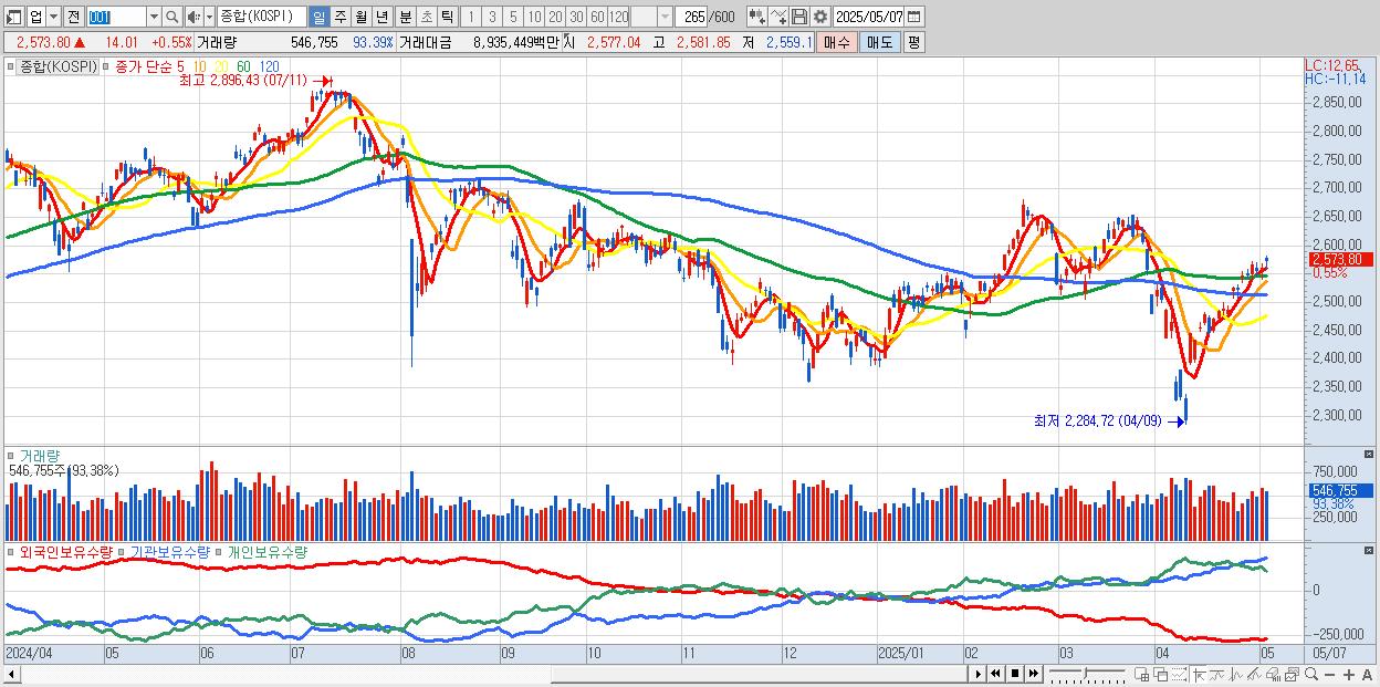 | 05/07 | 2,573.80 | ▲0.55% | -4,646억 | 3,487억 | 869억 | 289억 |
