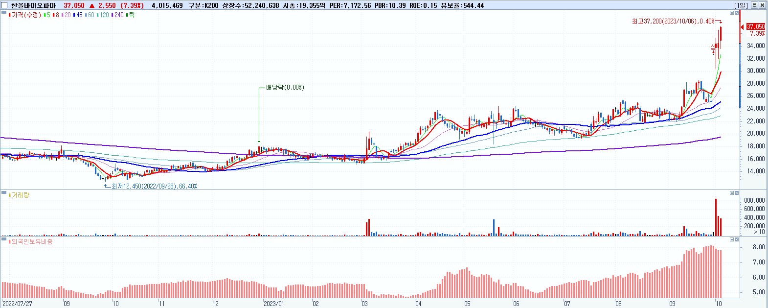 - 한올바이오파마 (37,050원 ▲ 7.39% , 시총: 19,355억, 거래량: 4,299,671, 거래대금:1,555억, KOSPI)