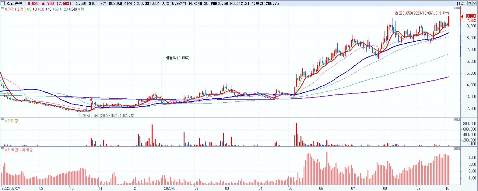 - 실리콘투 (9,820원 ▲ 7.68% , 시총: 5,925억, 거래량: 3,627,757, 거래대금:349억, KOSDAQ)