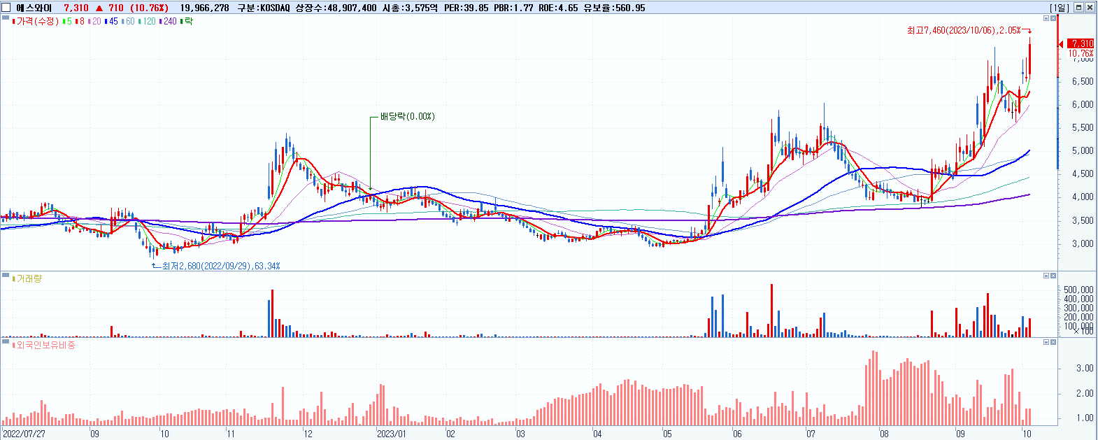 에스와이 7,310원 ▲ 10.76% (KOSDAQ, 109610)