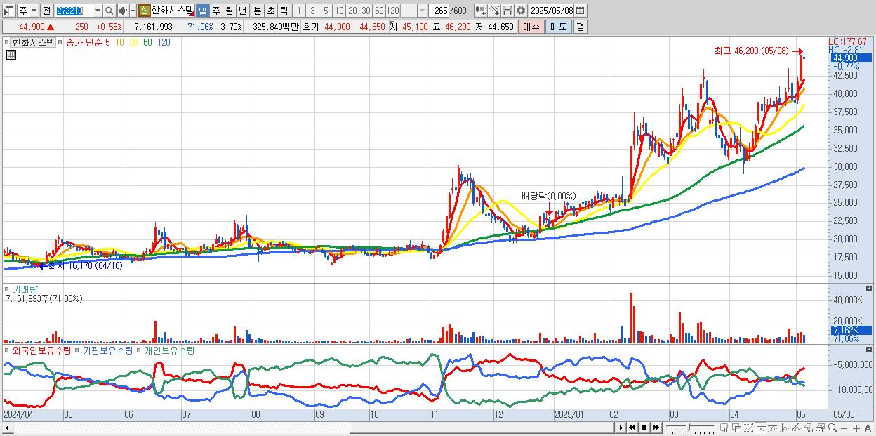 - 한화시스템 (45,250원 ▲ 1.34% , 시총: 85,486억, 거래량: 3,590,955, 거래대금:1,633억)