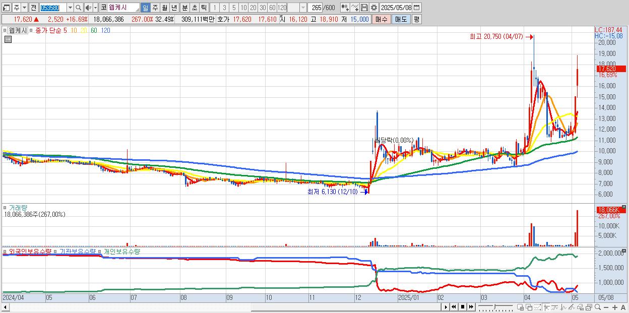 - 웹케시 (17,620원 ▲ 16.69% , 시총: 2,403억, 거래량: 18,066,386, 거래대금:3,091억)
