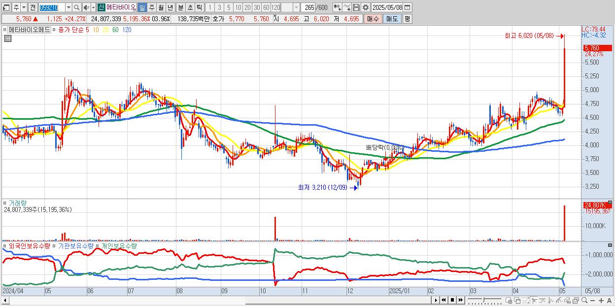 - 메타바이오메드 (5,760원 ▲ 24.27% , 시총: 1,374억, 거래량: 24,807,339, 거래대금:1,387억)