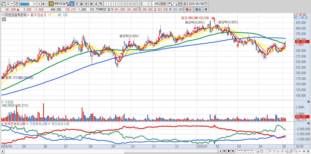 - HD현대일렉트릭 (343,000원 ▲ 2.24% , 시총: 123,642억, 거래량: 358,792, 거래대금:1,216억)