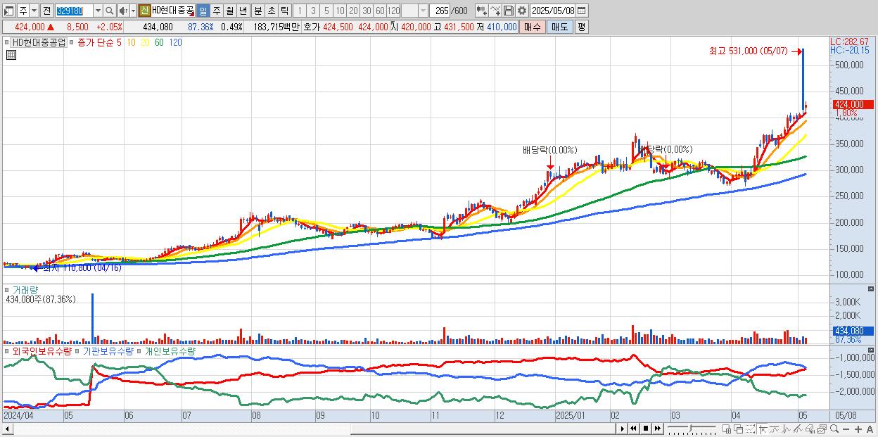 - HD현대중공업 (421,500원 ▲ 1.44% , 시총: 374,179억, 거래량: 316,537, 거래대금:1,340억)