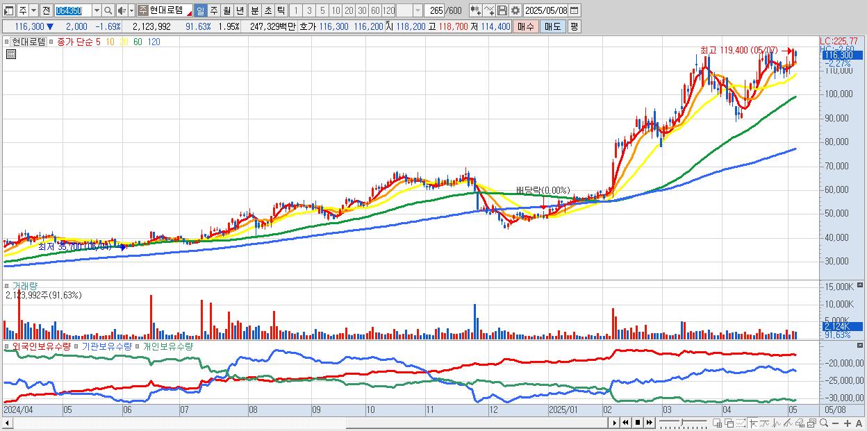 - 현대로템 (116,300원 ▼ -1.69% , 시총: 126,932억, 거래량: 1,503,830, 거래대금:1,750억)