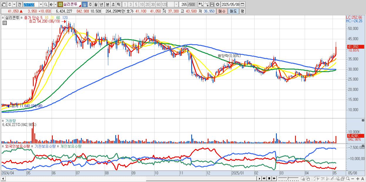 - 실리콘투 (41,300원 ▲ 11.32% , 시총: 25,264억, 거래량: 4,086,998, 거래대금:1,682억)