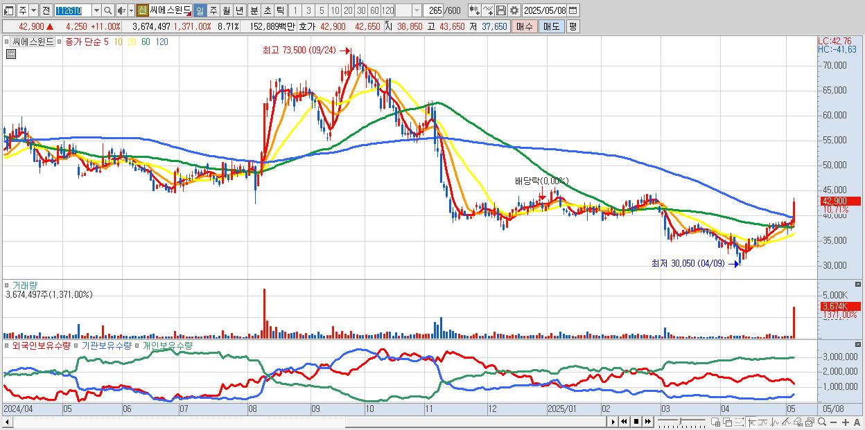 - 씨에스윈드 (42,850원 ▲ 10.87% , 시총: 18,070억, 거래량: 2,462,484, 거래대금:1,023억)