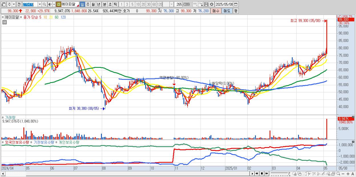 - 에이피알 (98,400원 ▲ 28.8% , 시총: 36,882억, 거래량: 6,642,662, 거래대금:6,162억)