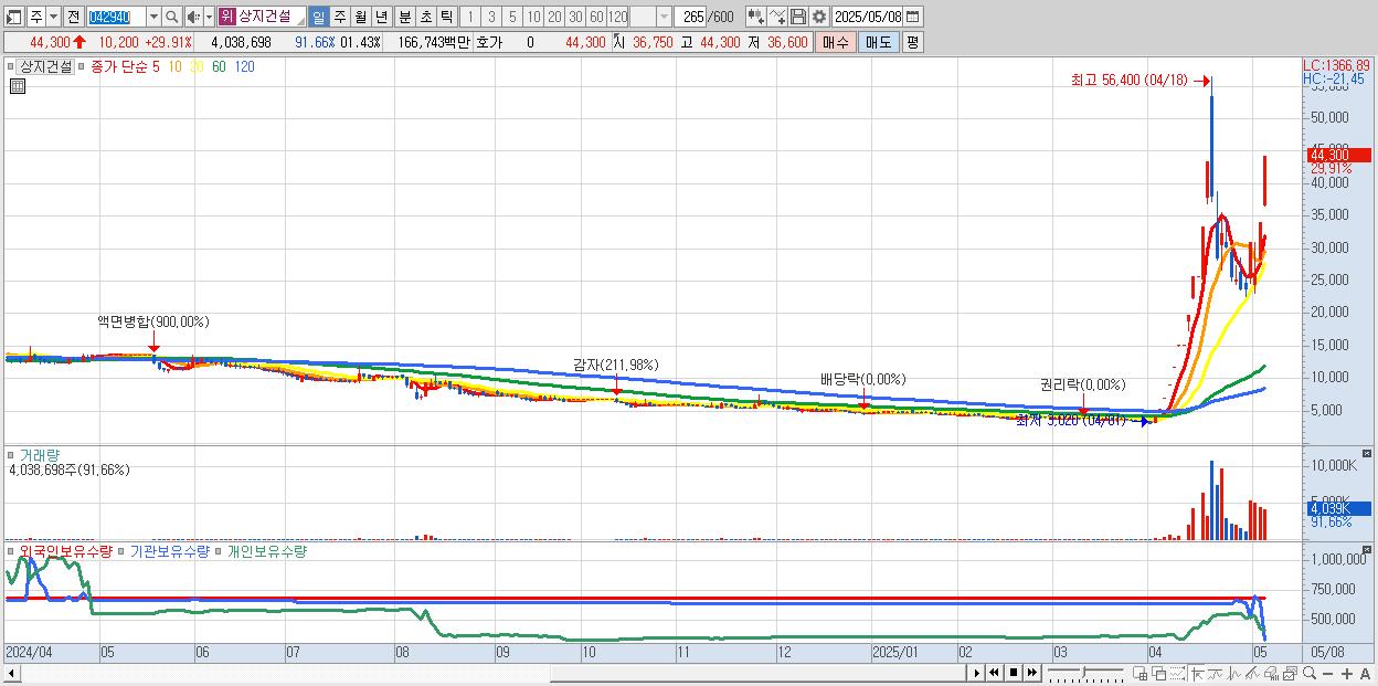 - 상지건설 (44,300원 ▲ 29.91% , 시총: 1,764억, 거래량: 4,038,698, 거래대금:1,667억)