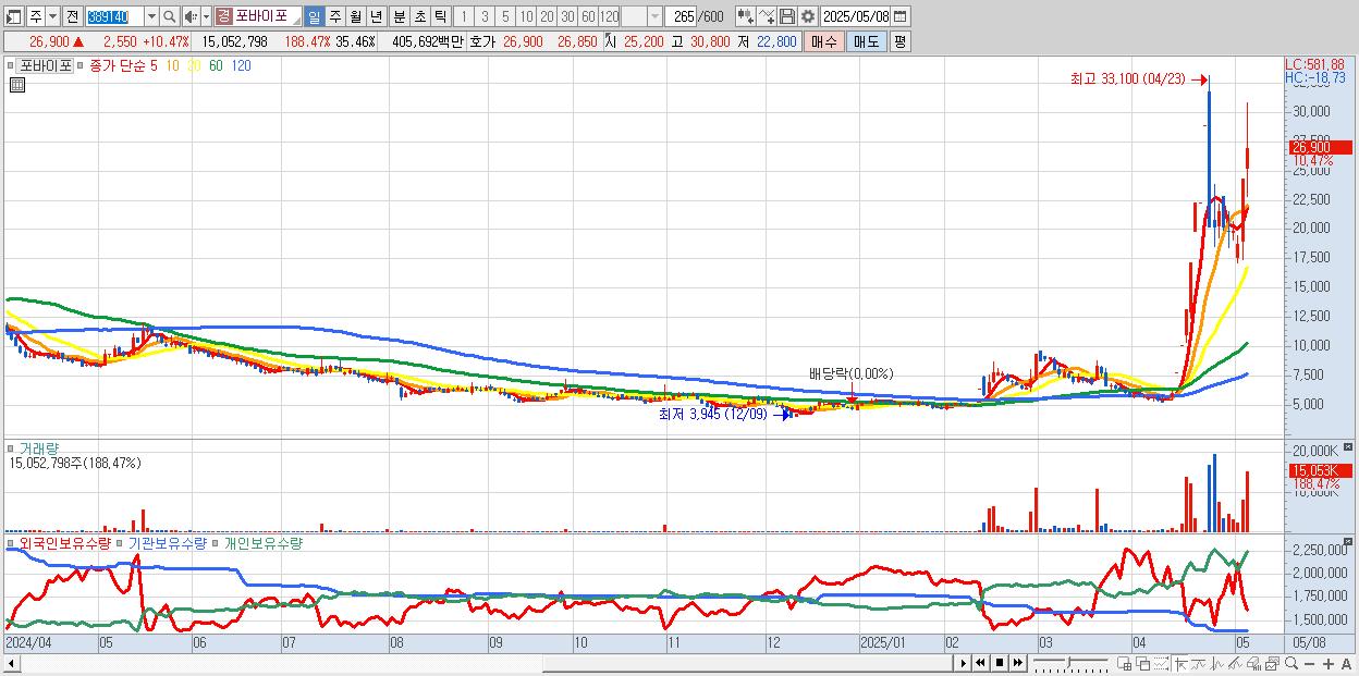 - 포바이포 (26,900원 ▲ 10.47% , 시총: 2,989억, 거래량: 15,052,798, 거래대금:4,057억)