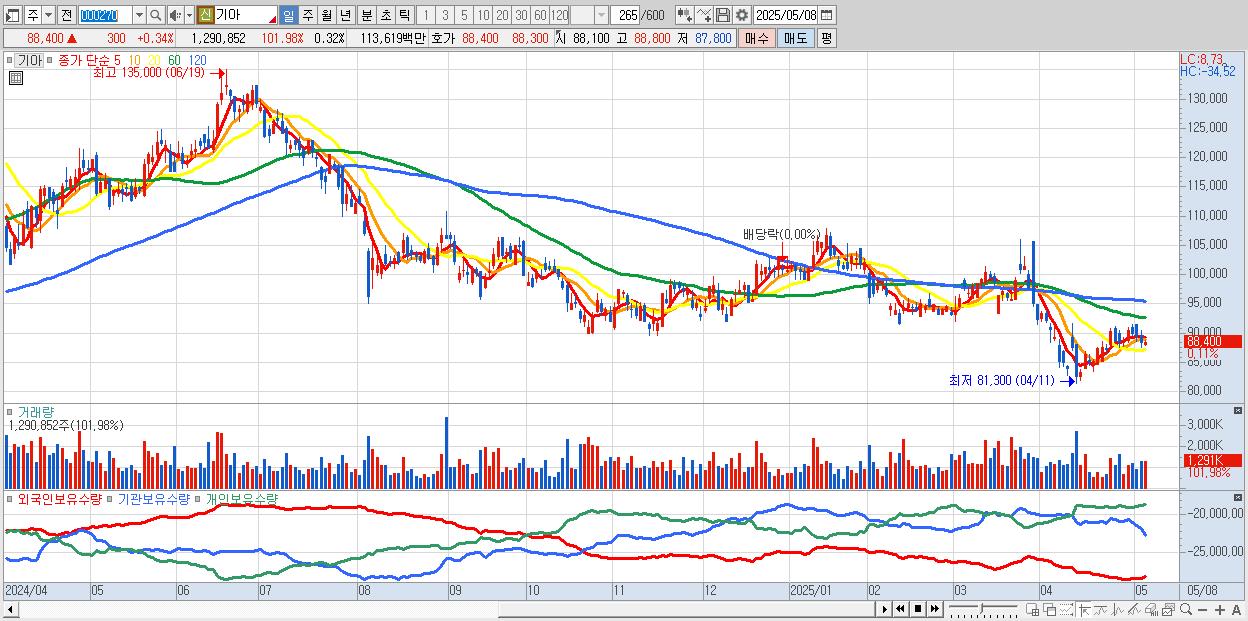 - 기아 (87,800원 ▼ -0.34% , 시총: 349,157억, 거래량: 1,161,546, 거래대금:1,022억)