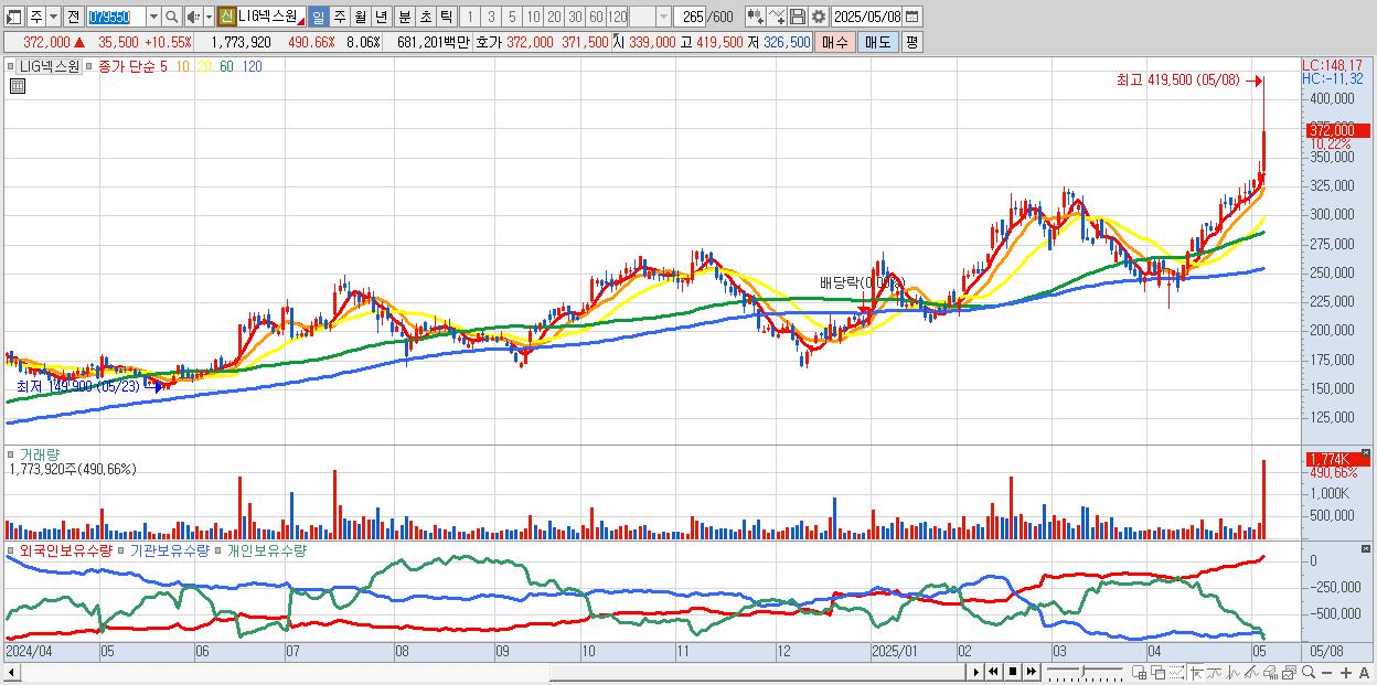 - LIG넥스원 (372,500원 ▲ 10.7% , 시총: 81,950억, 거래량: 1,292,916, 거래대금:4,968억)