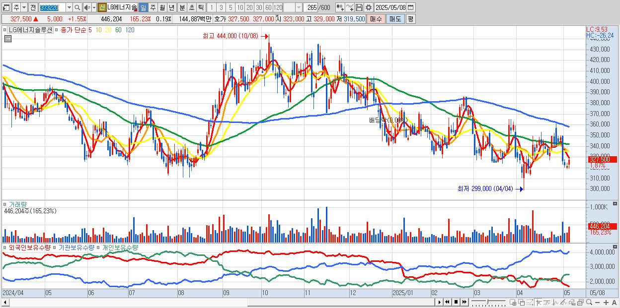 - LG에너지솔루션 (327,500원 ▲ 1.55% , 시총: 766,350억, 거래량: 384,939, 거래대금:1,250억)