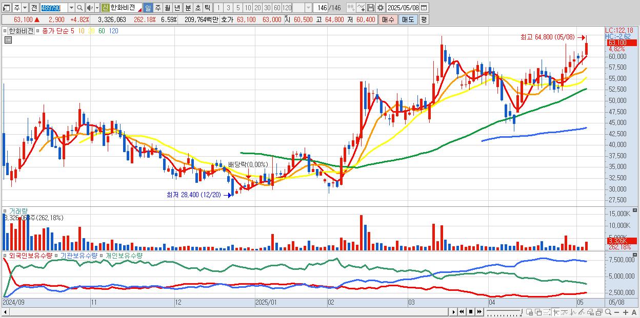 - 한화비전 (63,000원 ▲ 4.65% , 시총: 31,808억, 거래량: 1,964,066, 거래대금:1,240억)