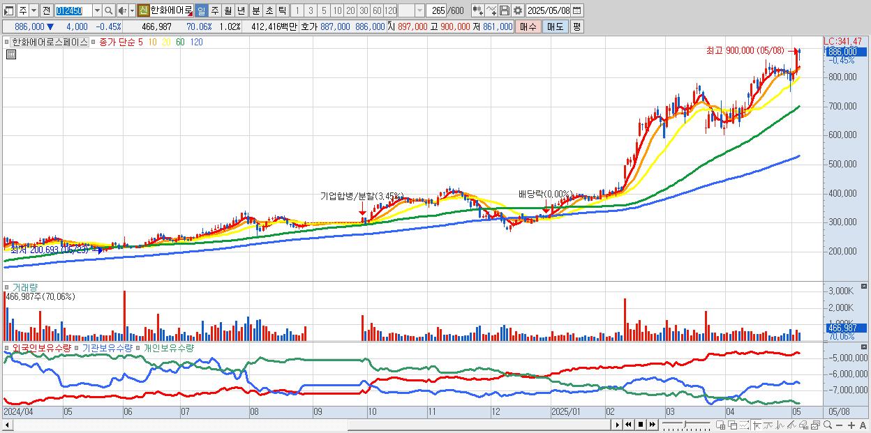 - 한화에어로스페이스 (883,000원 ▼ -0.79% , 시총: 402,482억, 거래량: 324,345, 거래대금:2,863억)