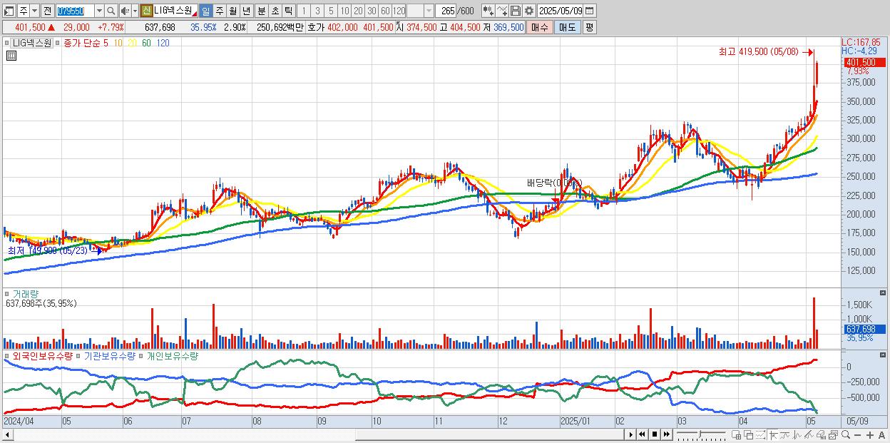 - LIG넥스원 (402,000원 ▲ 7.92% , 시총: 88,440억, 거래량: 414,952, 거래대금:1,634억)